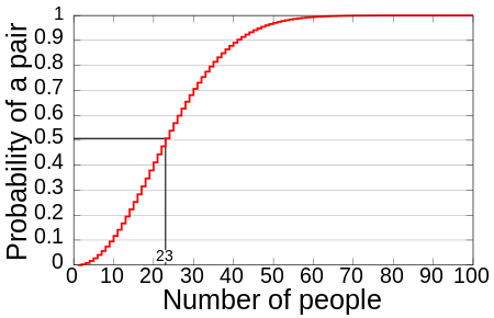 위 그림은 인간의 직관과 달리 23명 이상 모이면 이 중 두 명이 생일이 같은 확률이 1/2 (50% 이상)임을 보여준다.