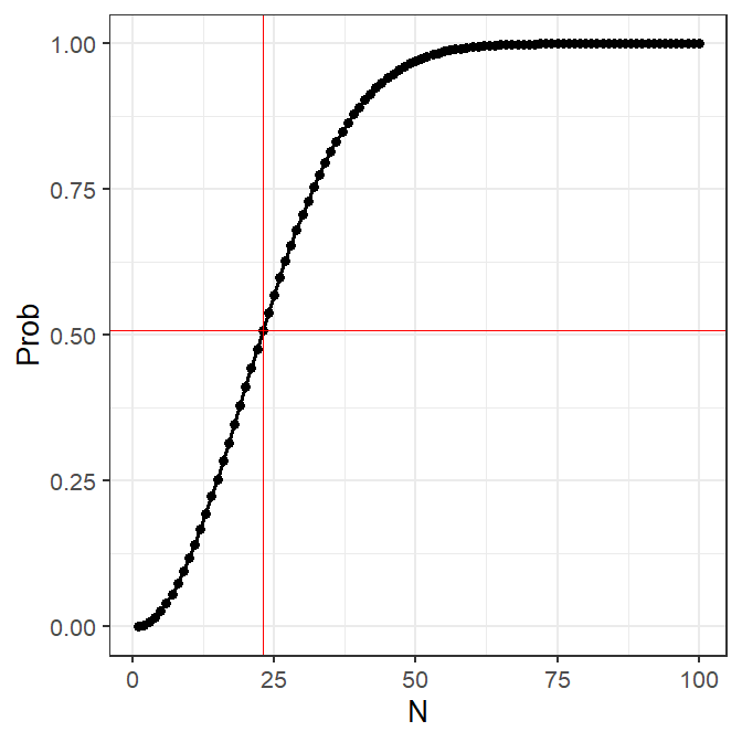 N=23 , 두 명이 생일이 같을 확률: 0.51